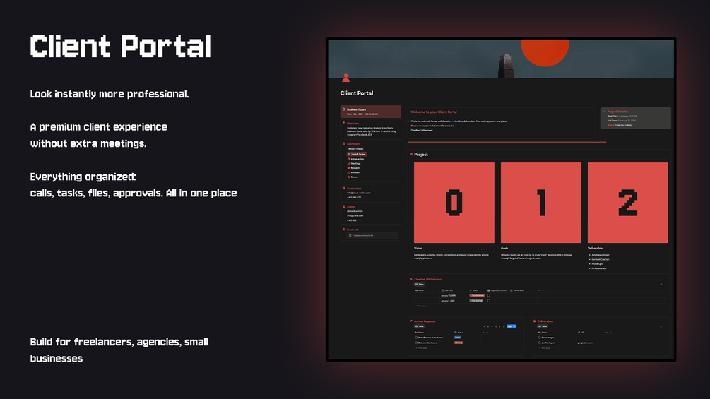 Freelancers, agencies, consultants, video editors, designers, developers — anyone delivering work to clients and wanting a clean, premium system.